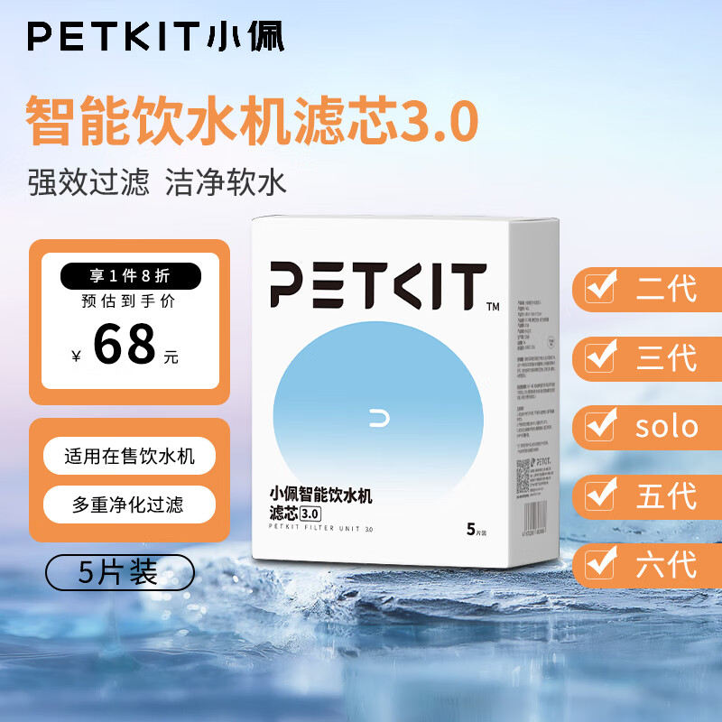 小佩宠物猫咪饮水机 智能第六代不锈钢自动循环过滤狗饮水机器可恒温 3.0滤芯5片装(通用型)