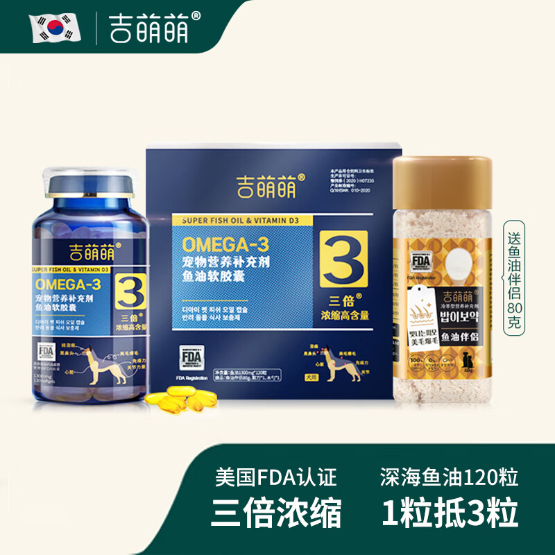 吉萌萌狗狗鱼油宠物鱼油三文鱼油卵磷脂美毛防掉毛黑鼻头浓缩鱼油亮毛护肤宠物营养保健用品套装狗狗用120粒