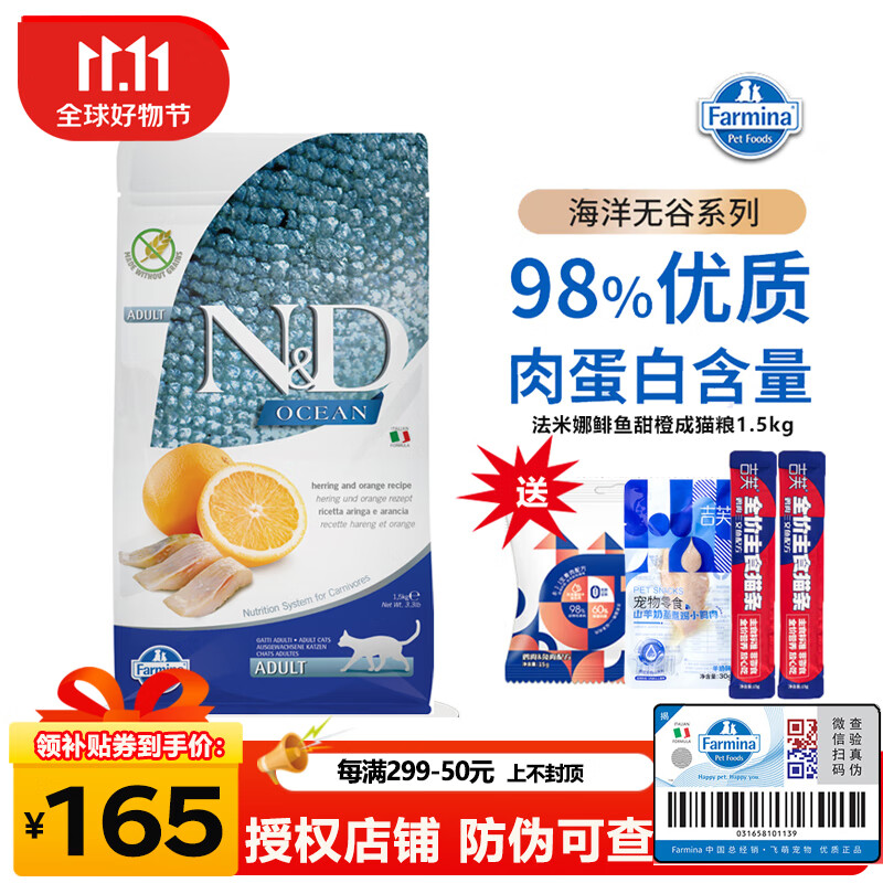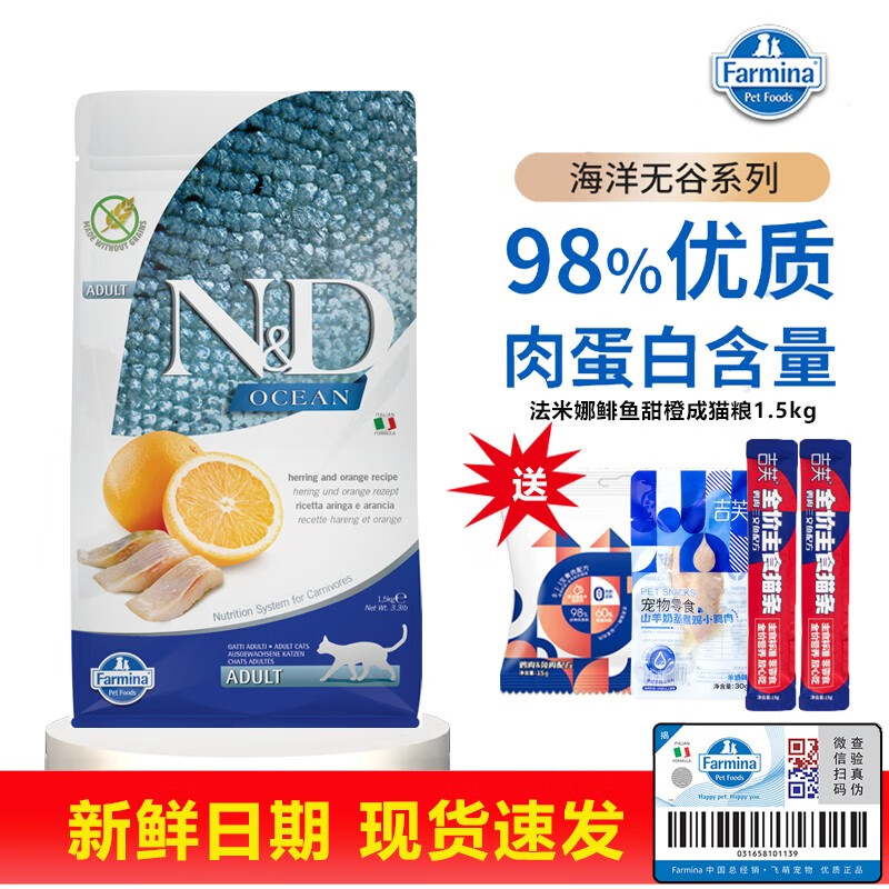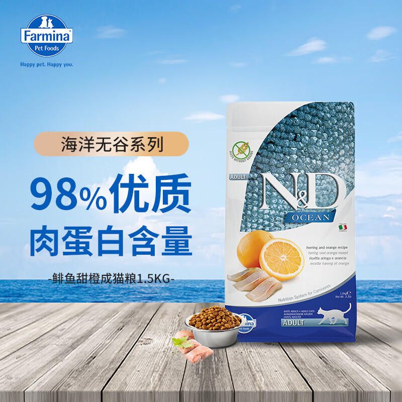 法米娜farmina猫粮鸡鱼猪肉无谷猫主粮意大利进口成幼猫猫粮营养猫食品 海洋无谷-鲱鱼甜橙成猫粮1.5kg