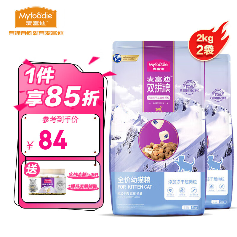 麦富迪猫粮 三文鱼冻干双拼超肉粒猫粮 全猫通用粮食 超肉粒冻干双拼 幼猫粮2kg*2袋