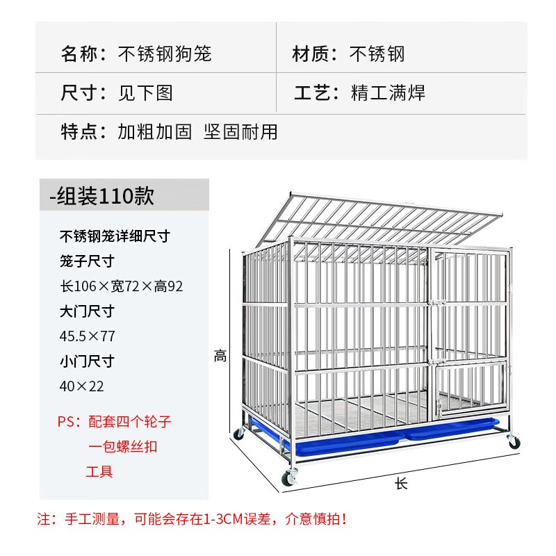 憨憨宠 【氩弧焊满焊】不锈钢狗笼中型小型犬狗笼子猫笼宠物狗狗笼子狗屋金毛拉布拉多柯基法斗用品 组装款-长106*宽72*高92cm-带喂食门
