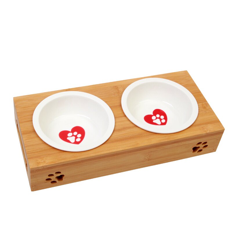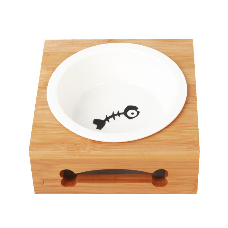 陶瓷竹盆猫碗双食碗食盆猫咪仿木天然竹架餐桌猫小狗宠物喂粮食。