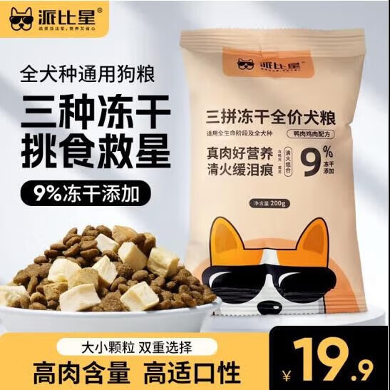 派比星狗粮幼犬成犬通用无谷鲜肉全价低敏鸭肉梨缓泪痕小中大型犬狗干粮 三拼冻干通用狗粮200g*2