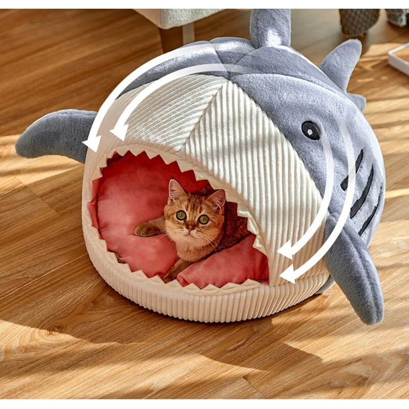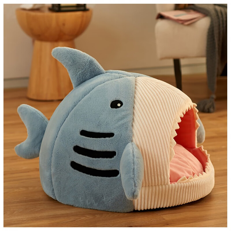 凛东 冬季保暖宠物猫狗窝网红大嘴鲨鱼猫咪窝半封闭猫狗窝四季通用 蓝色 L(50*50*36)适合15斤的猫狗