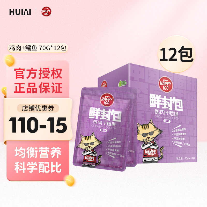 wanpy顽皮猫零食鲜封包12包猫湿粮金枪鱼肉鸡肉罐头妙鲜包 鸡肉 鳕鱼70g*12袋