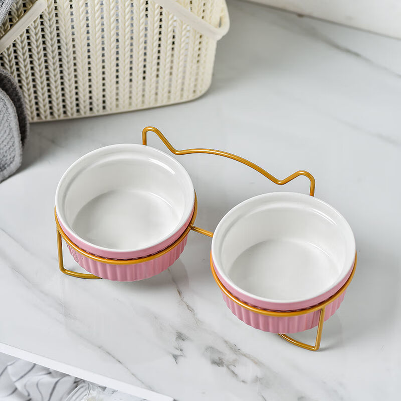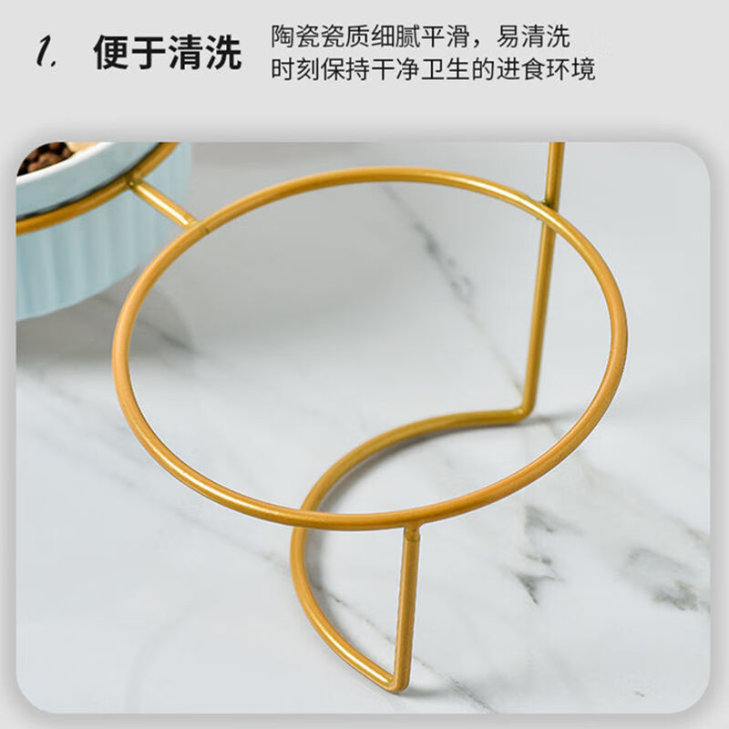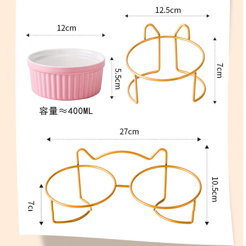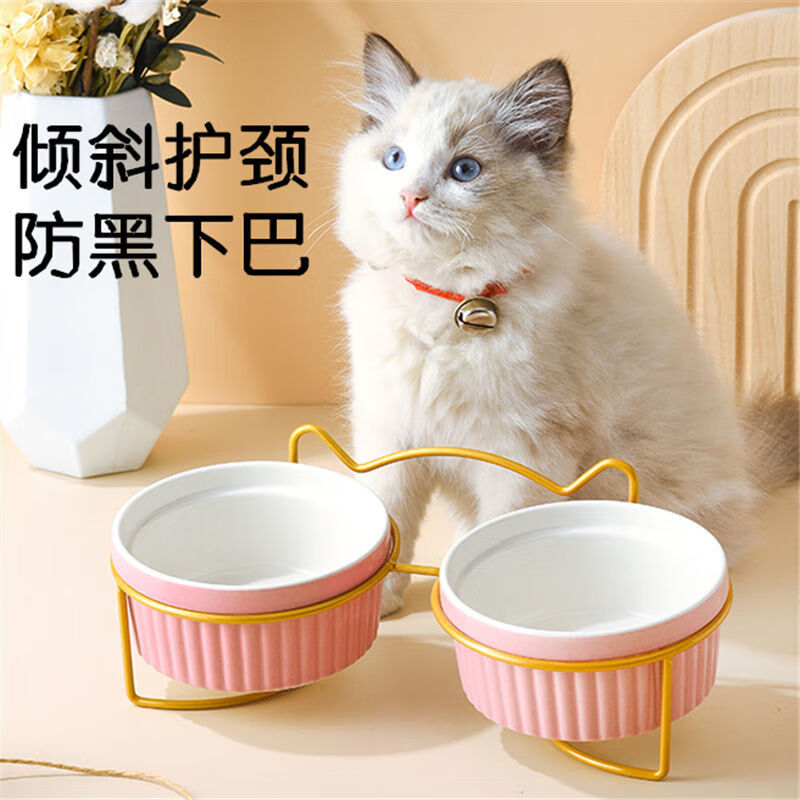 JHHUIYA猫碗陶瓷高脚护颈双碗固定架防打翻宠物猫狗食盆水碗倾斜保护颈椎 亮金[护颈支架] 俩个碗 俏丽粉[防黑下巴]