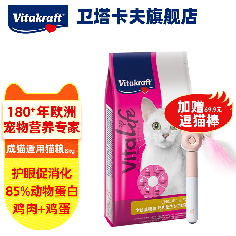 卫塔卡夫(Vitakraft)全价成猫鸡肉鸡蛋德国配方无谷粮增肥发腮猫干粮食品主粮宠物猫咪 成猫8KG鸡肉鸡蛋配方