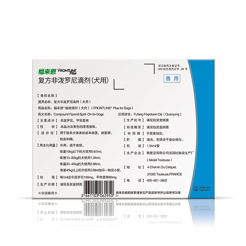 福来恩(FRONTLINE)狗体外驱虫滴剂 中型犬宠物狗去跳蚤蜱虫驱虫药品法国进口 1.34ml*3支装(会员店专享)