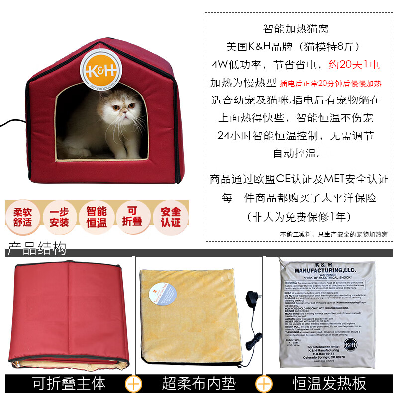 冬季智能恒温猫窝 智能恒温加热猫窝屋小型犬狗窝发热电热窝冬季保暖宠物窝猫房子 插电盖上毛毯20分钟后有温度 41*38.1*36CM-超低温4W
