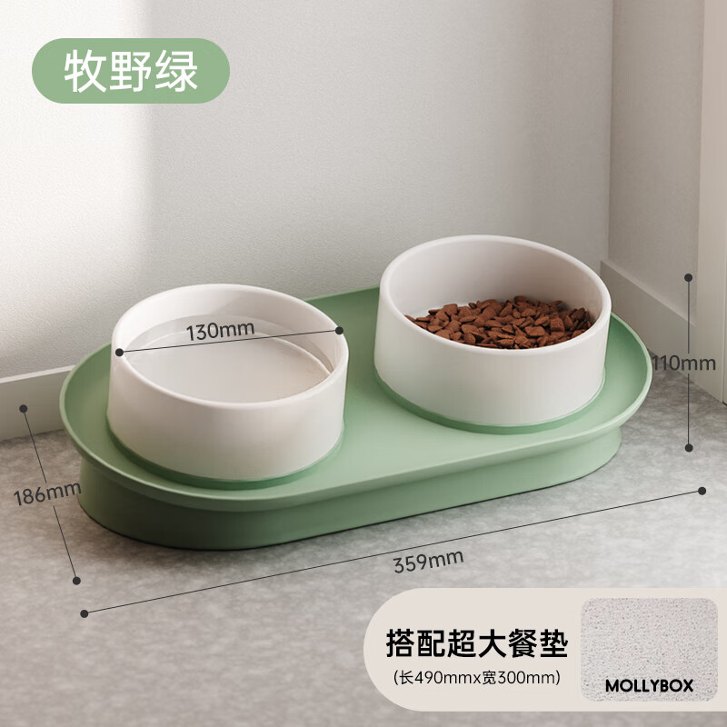 猫碗陶瓷双碗狗碗猫食盆保护颈椎猫粮盆喝水碗狗盆防打翻宠物用品 【防漏食碗架 陶瓷双碗 防滑餐垫】牧野绿 30斤内猫狗通用从小用到大.