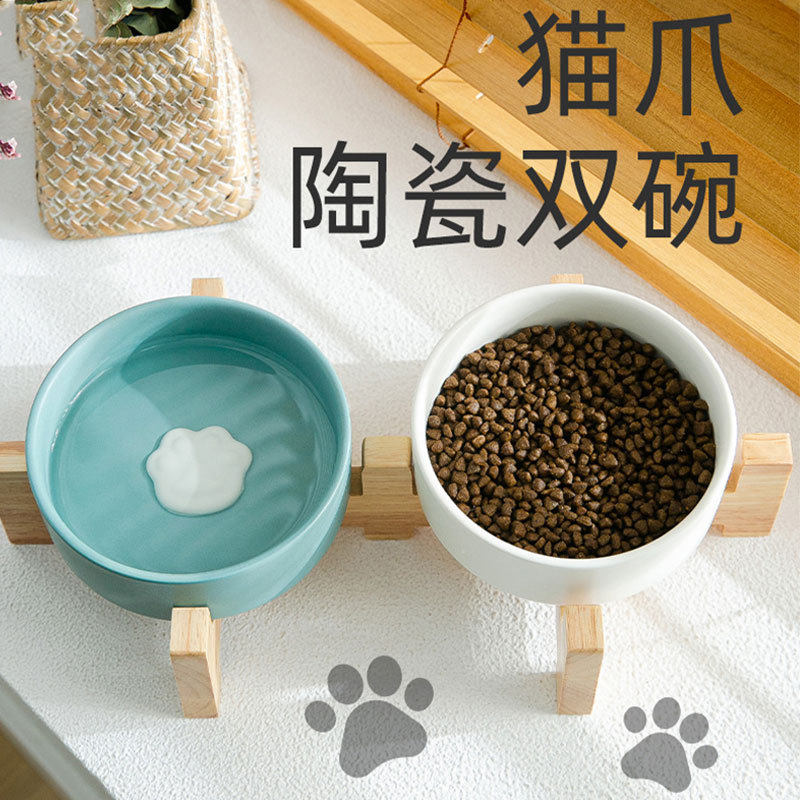 猫碗 防打翻 猫用粮碗陶瓷双碗护颈椎高脚猫食盆粮碗猫咪水碗用品