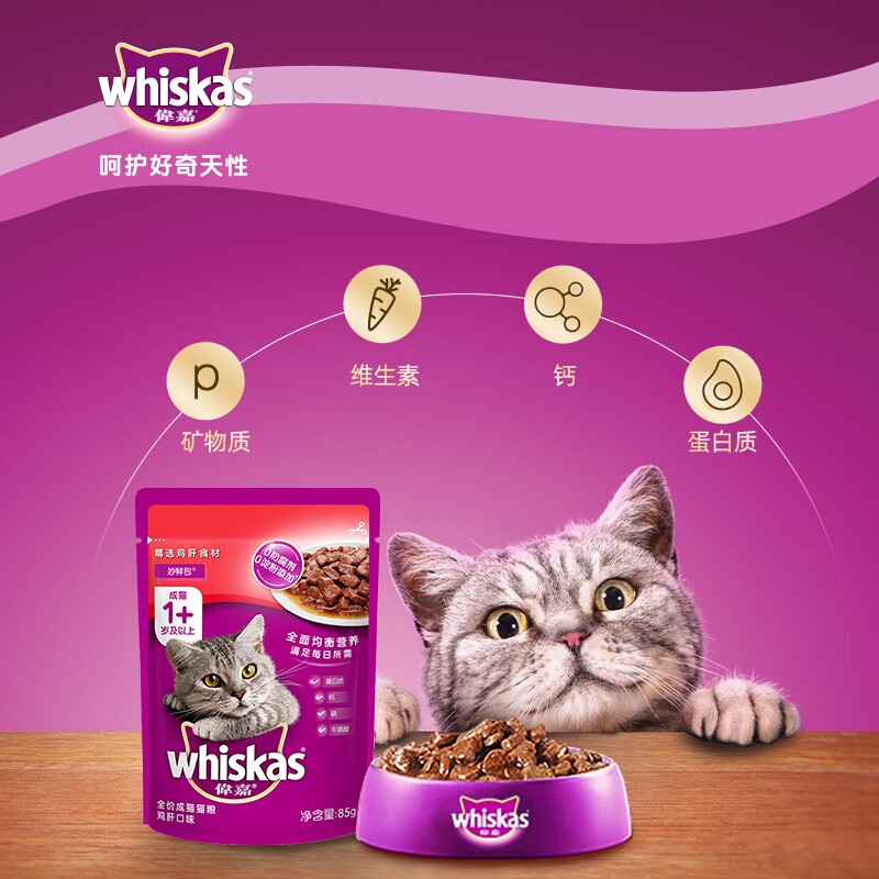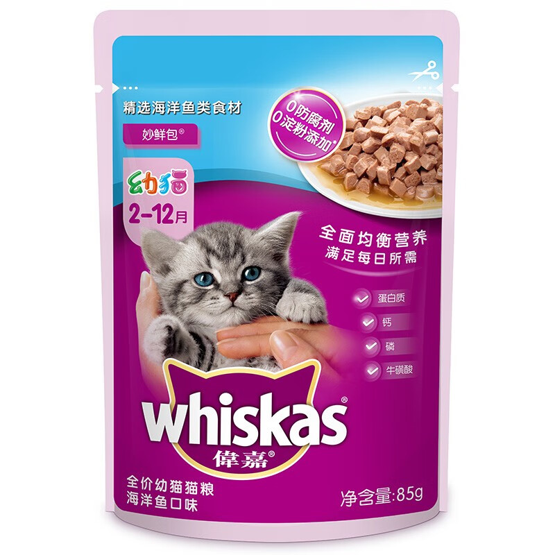 伟嘉(Whiskas) 妙鲜包幼猫 成猫湿粮罐头 猫咪补水零食 猫粮主食罐 猫粮 增肥护肤美毛 幼猫妙鲜包海洋鱼85g*12袋