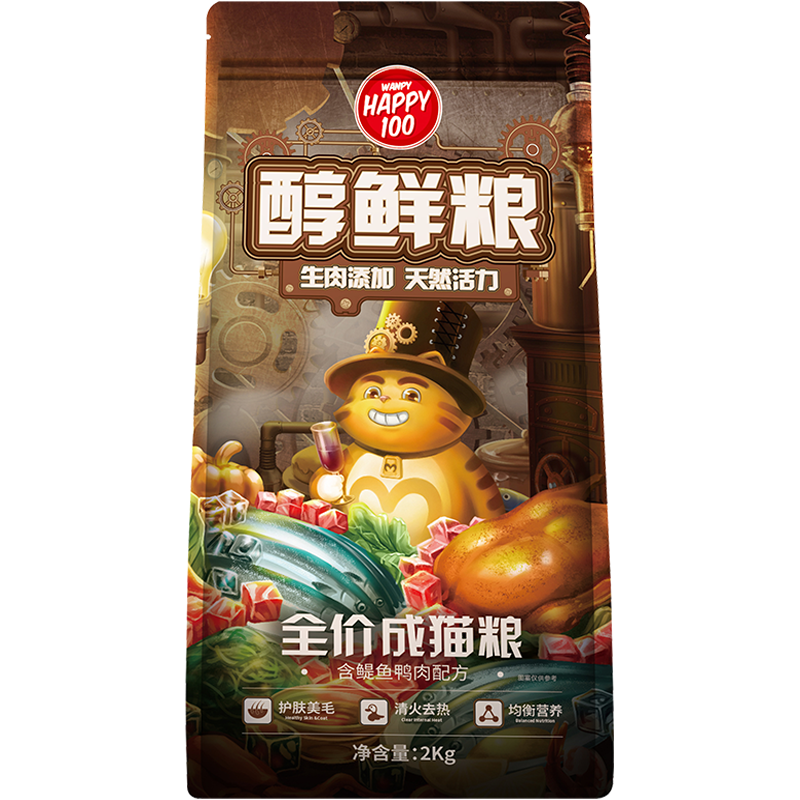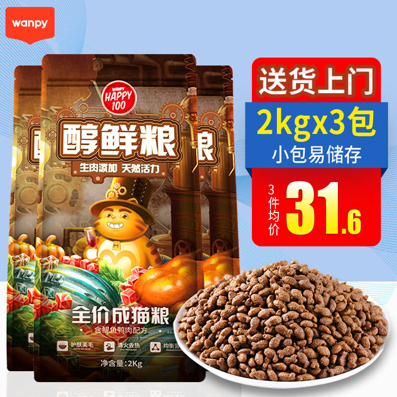 顽皮Happy100 醇鲜猫粮 全价成猫通用猫粮 星厨联盟系列 成猫 含鳀鱼鸭肉配方2kg*3包