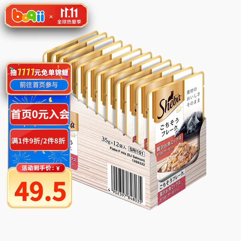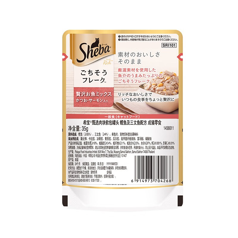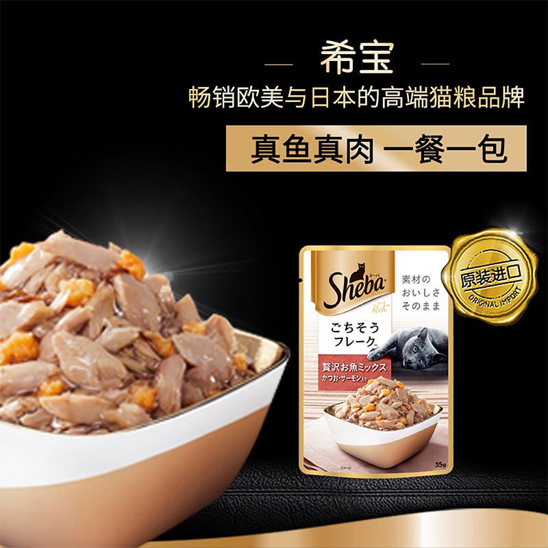 希宝(Sheba)猫湿粮零食 幼猫成猫大龄老年猫妙鲜包零食 宠物猫咪肉块软包 甄选肉块软包鲣鱼三文鱼成猫 35g*12包