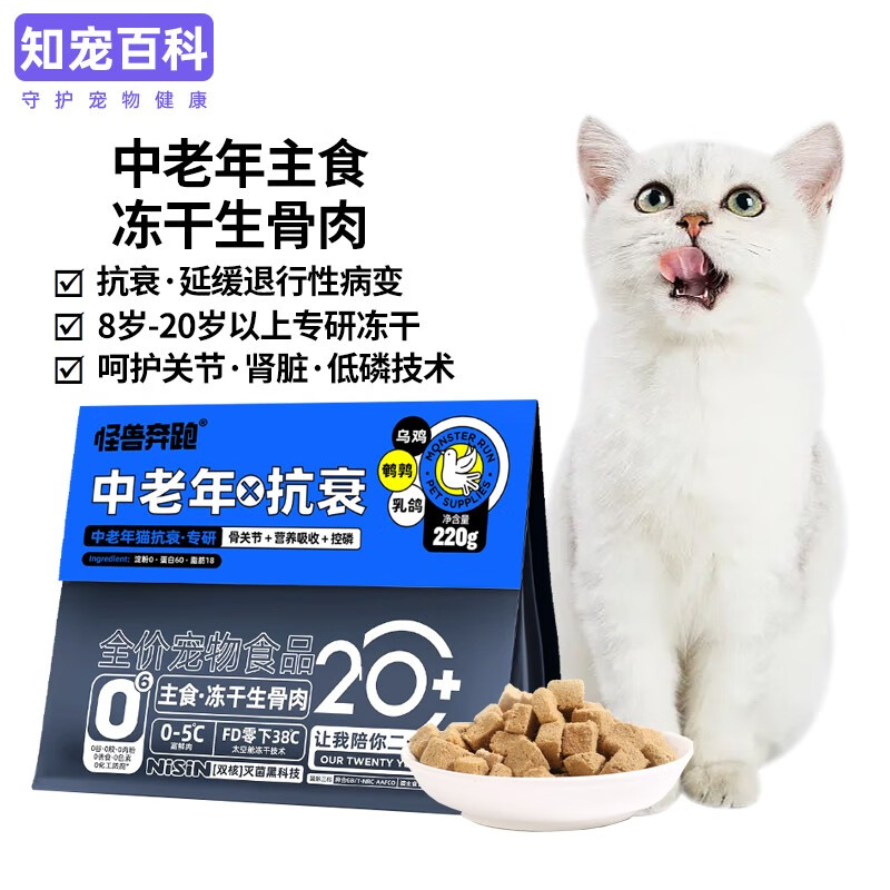 知宠百科 怪兽奔跑主食冻干生骨肉猫咪零食成幼猫高蛋白猫粮护肠胃免疫力 【中老年】抗衰专研220g