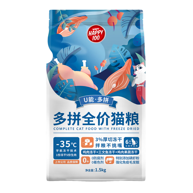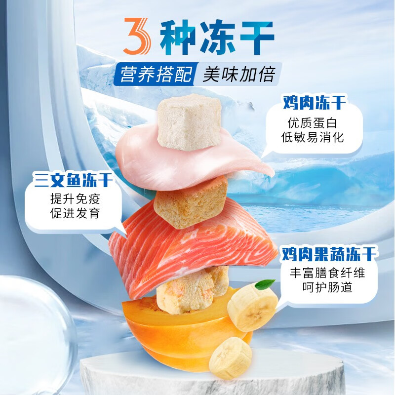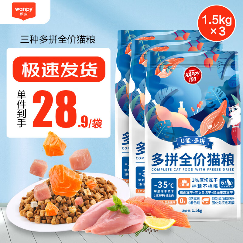 顽皮(Wanpy) 冻干三文鱼鸡肉双拼猫粮 多拼粮醇鲜全价通用粮 多拼冻干猫粮1.5kg*3包