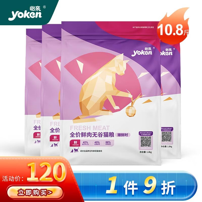 怡亲(yoken)鲜肉无谷猫粮增肥发腮变胖幼猫成猫1.8kg大袋全阶段通用 鸡肉味【1.8kg*3】