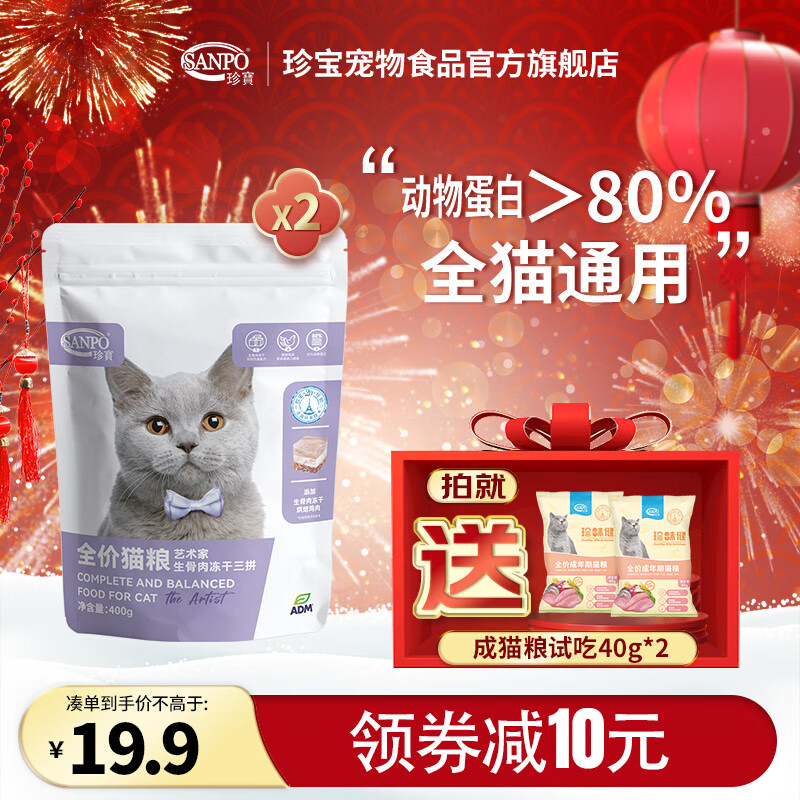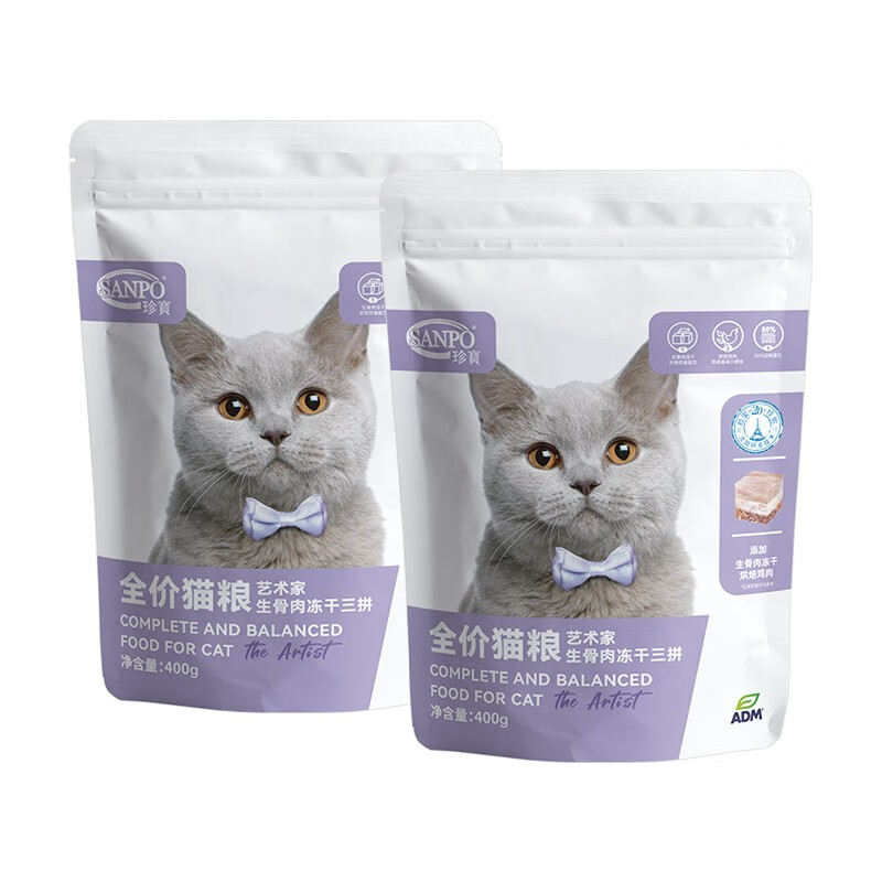珍宝(SANPO)ADM珍宝大艺术家系列 猫粮生骨肉冻干三拼成年幼年全猫期猫粮 400g*2袋 全猫期