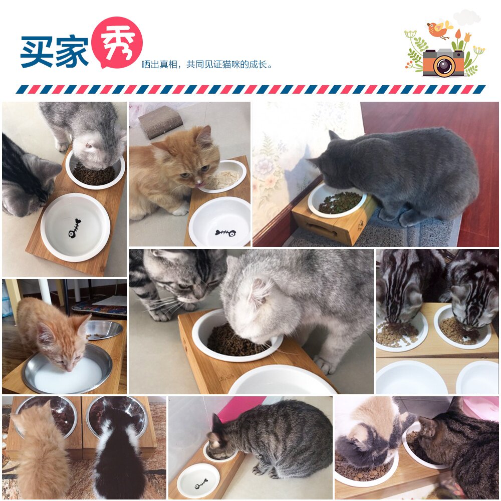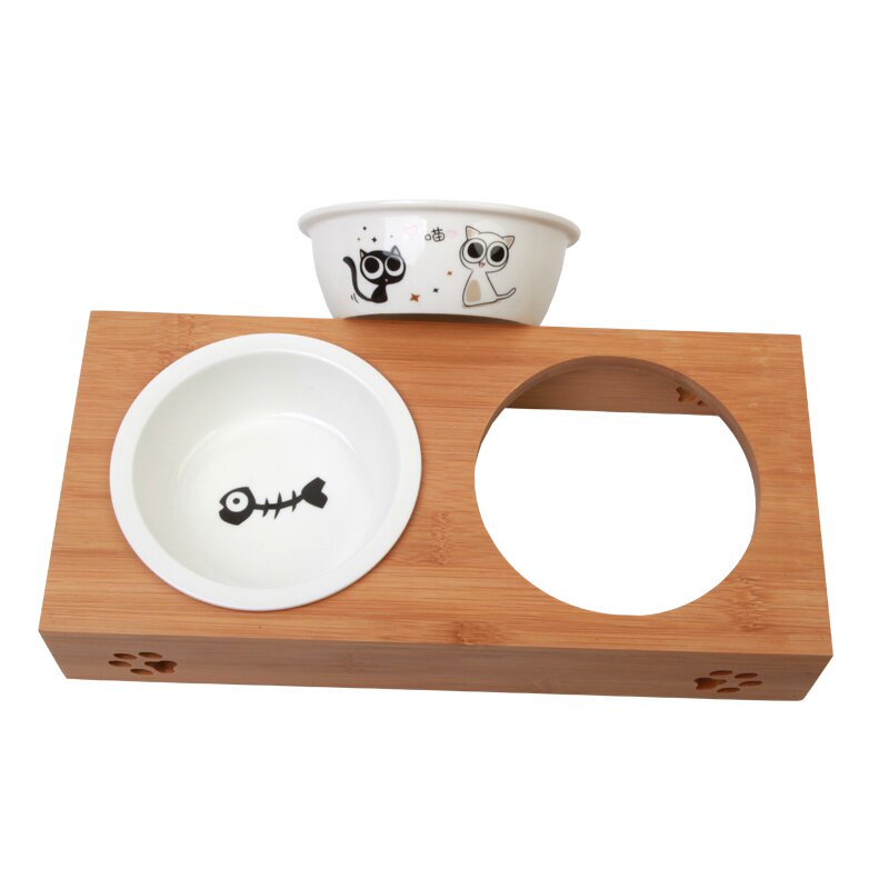 陶瓷竹盆猫碗双食碗食盆猫咪仿木天然竹架餐桌猫小狗宠物喂粮食。