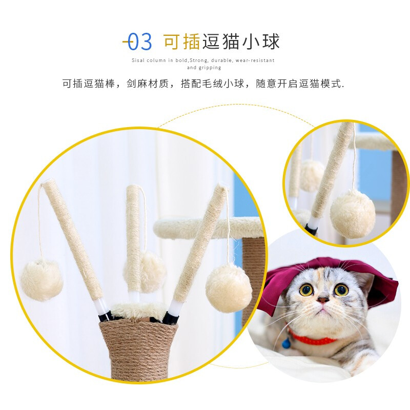 麻绳猫爬架猫窝一体大型不占地免打孔易安装实木稳固加粗跳台猫架 单柱吊球(米色)