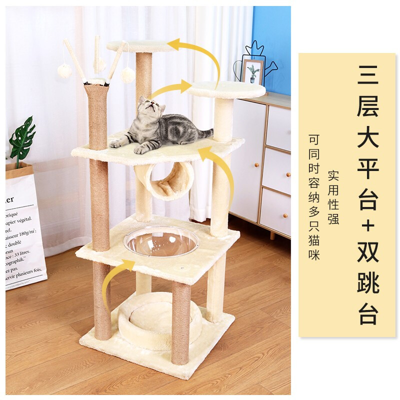 麻绳猫爬架猫窝一体大型不占地免打孔易安装实木稳固加粗跳台猫架 多功能三窝(米色)