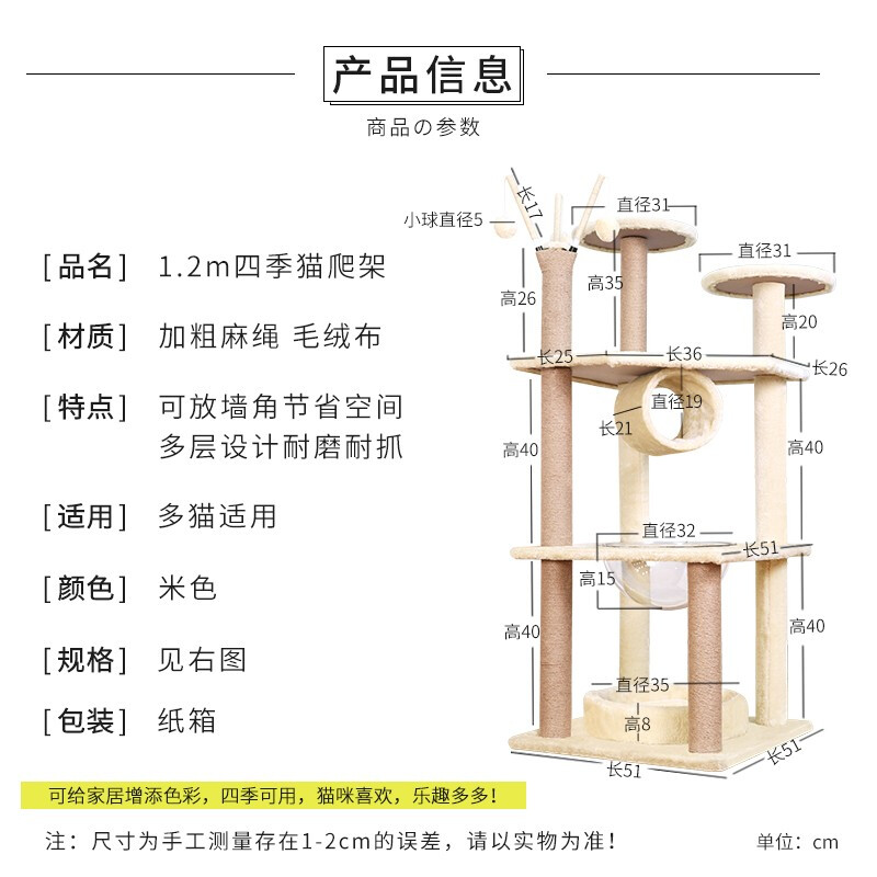 猫爬架大型豪华猫架子太空舱猫窝猫树猫跳台耐磨剑麻猫抓柱宠物猫咪用品 1.2米四季猫爬架