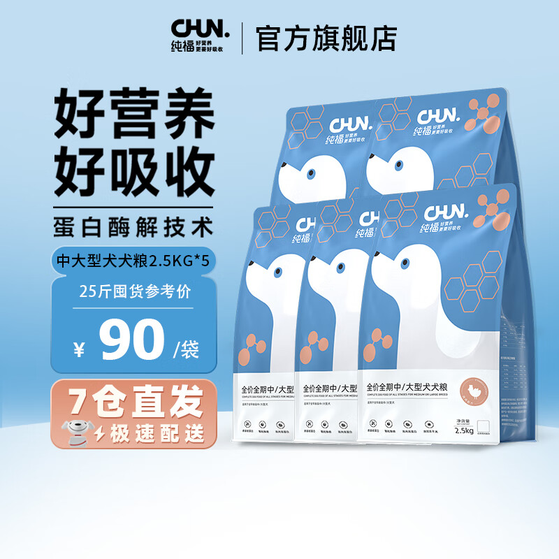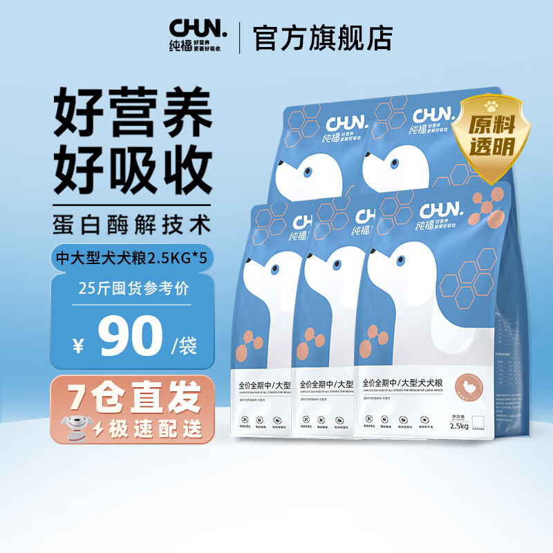 纯福(chunfu)通用型金毛拉布拉多边牧中型犬大型犬幼犬成犬专用酶解冻干狗粮 中大型犬粮12.5kg【5包装】