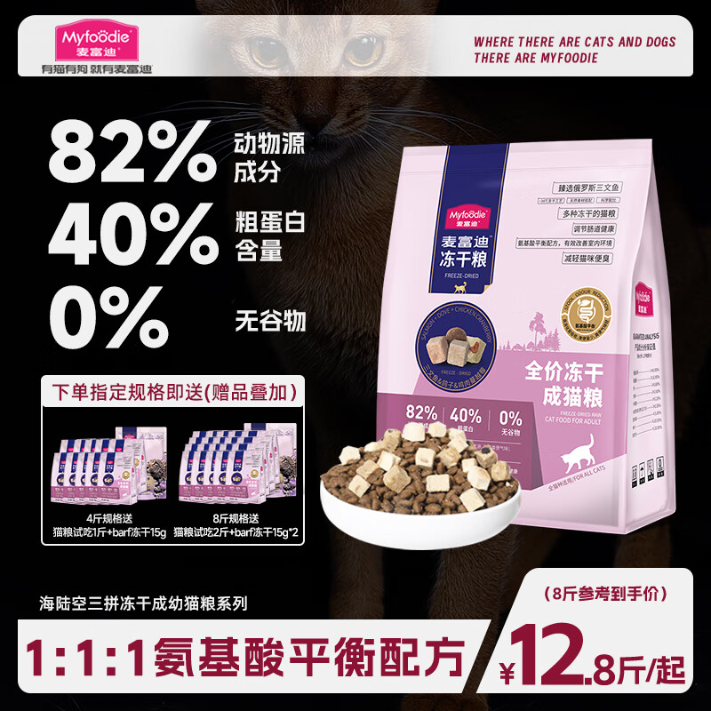 麦富迪(Myfoodie)三拼冻干猫粮幼猫成猫无谷物通用猫咪主食奶糕专用10斤 【成猫总到手10斤】4斤*2包 0g具体以食品口味为准