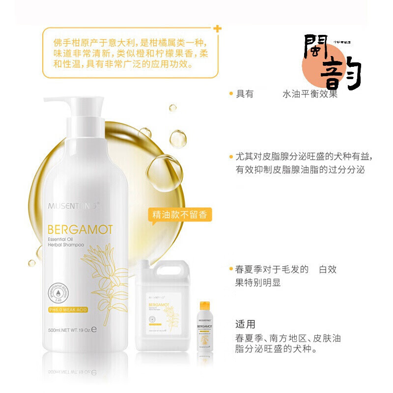 沐森堂沐浴露沐森堂宠物洗浴液宠物草本薰衣草佛手柑夏威夷果玫瑰浴液狗狗猫咪沐浴露弹力素 佛手柑精油草本香波500ML