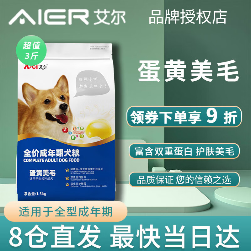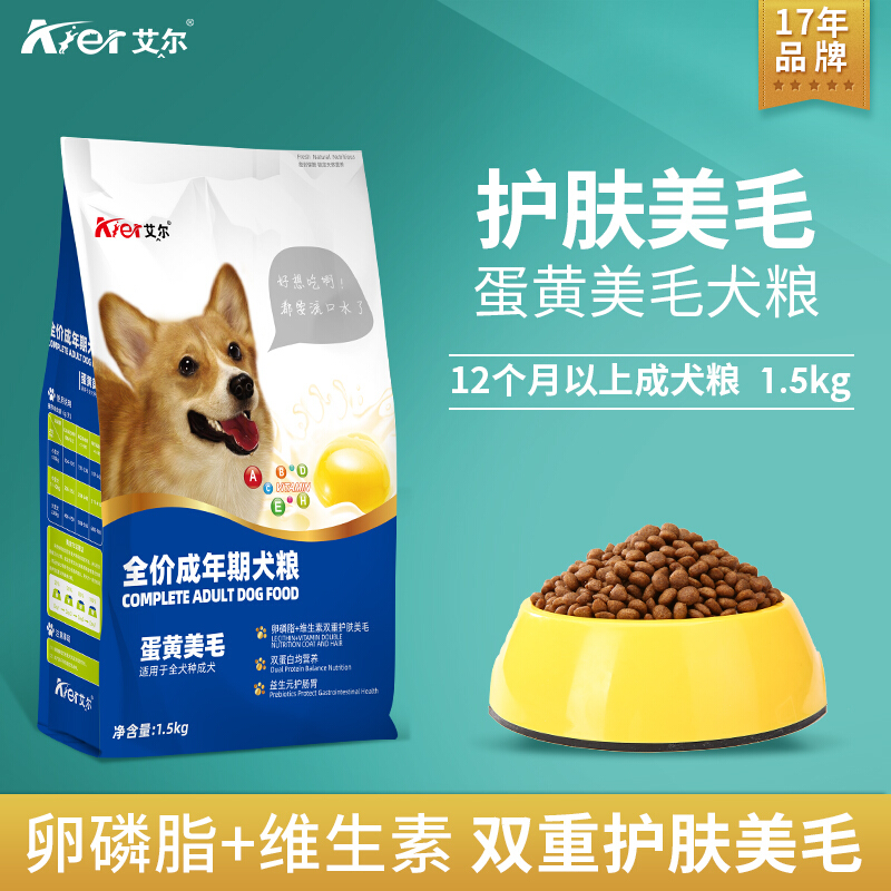 艾尔(Aier)狗粮小型犬宠物狗通用主粮天然粮美毛泰迪金毛萨摩耶犬粮 蛋黄美毛成犬狗粮1.5kg 3斤