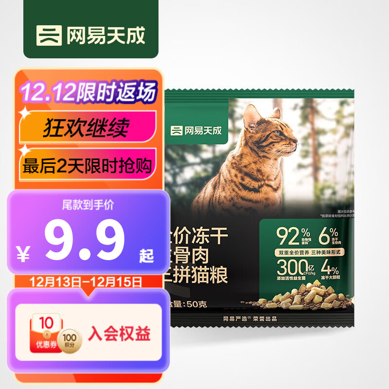 网易天成 全价冻干生骨肉三拼猫粮 高肉含量益生菌宠物主粮幼猫成猫全价 50克/袋