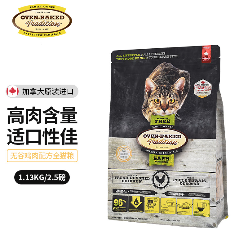 Oven-baked欧恩焙加拿大进口无谷物配方全猫低温烘焙粮1.13kg/袋(2.5磅)鸡/鸭/鱼 鸡肉猫粮2.5磅