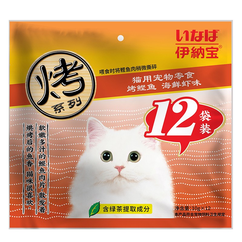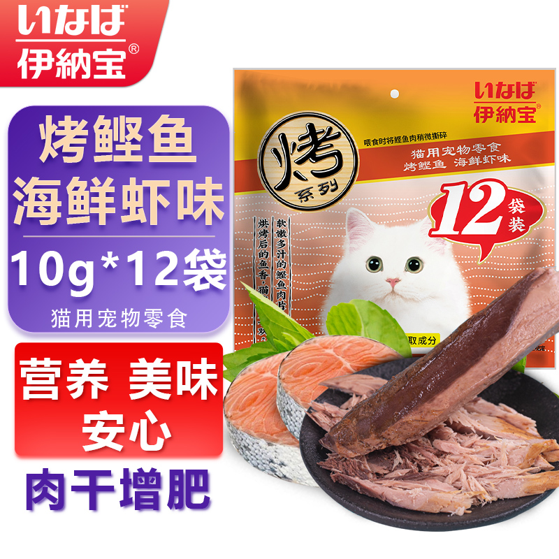 伊纳宝妙好猫用宠物零食 烤鲣鱼实惠大包装 海鲜鱼肉干肉条营养猫零食 海鲜虾味10g*12袋
