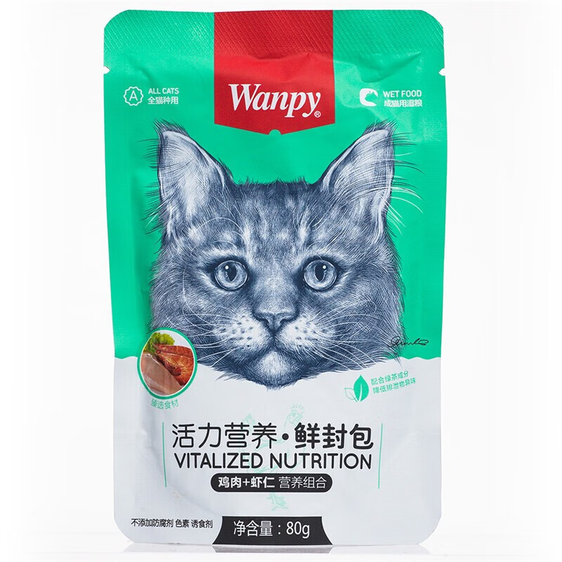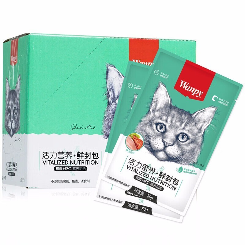 顽皮(Wanpy)猫咪鲜封包 宠物猫粮肉粒包 猫湿粮妙鲜包整盒装 鸡肉 虾仁80g*10袋