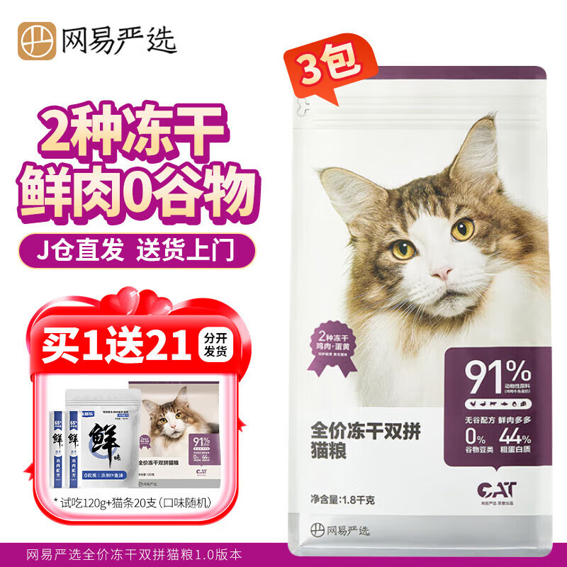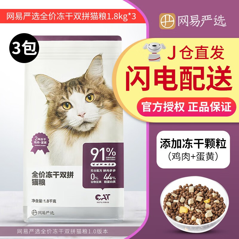 网易严选猫粮冻干双拼粮全价猫粮鸡肉蛋黄冻干成猫幼猫宠物猫主粮 冻干猫粮5.4kg(1.8kg*3)
