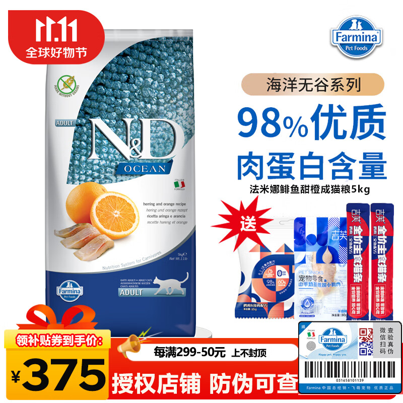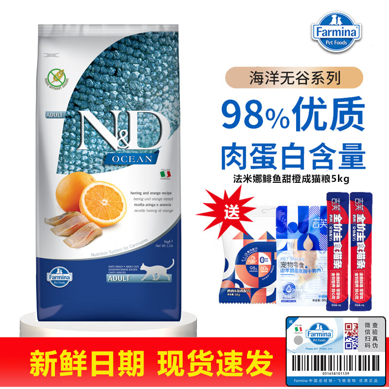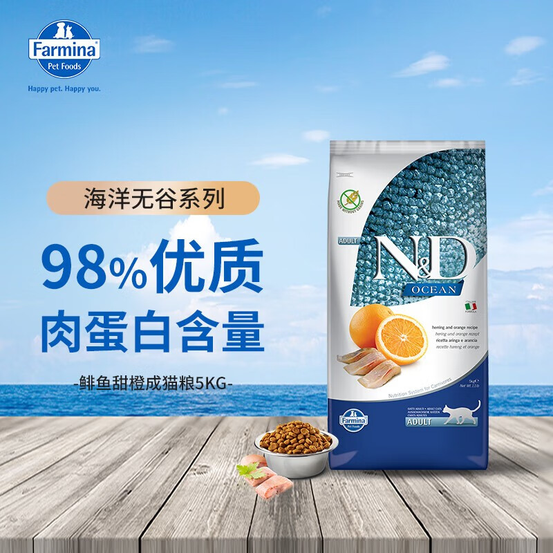 法米娜farmina猫粮鸡鱼猪肉无谷猫主粮意大利进口成幼猫猫粮营养猫食品 海洋无谷-鲱鱼甜橙成猫粮5kg