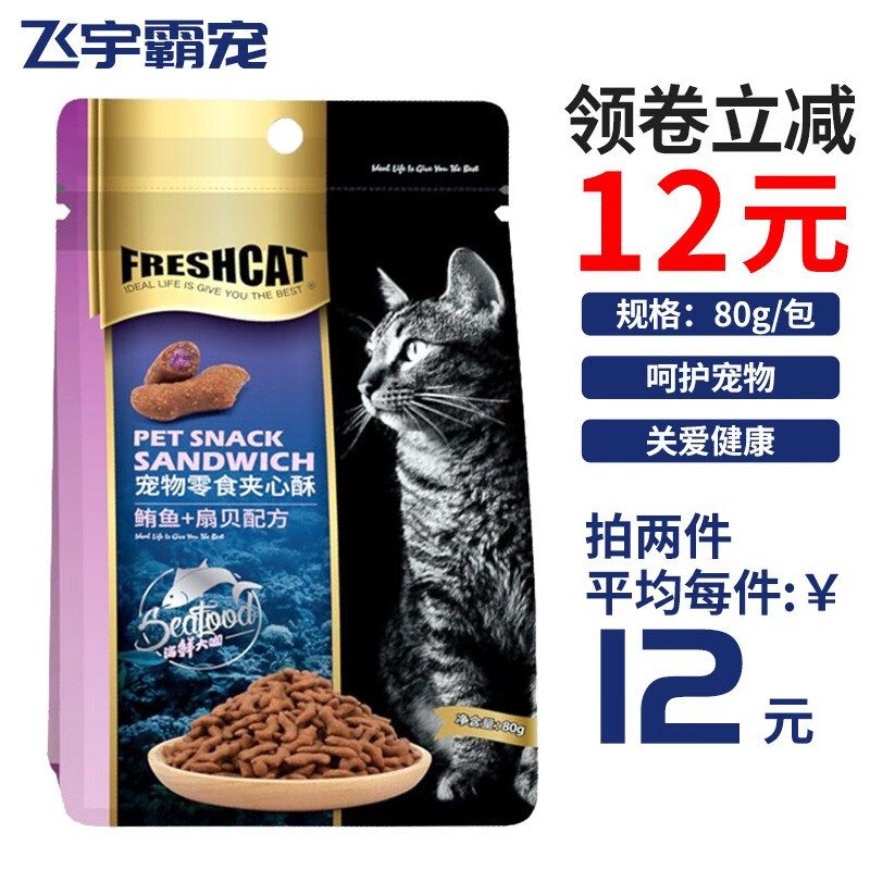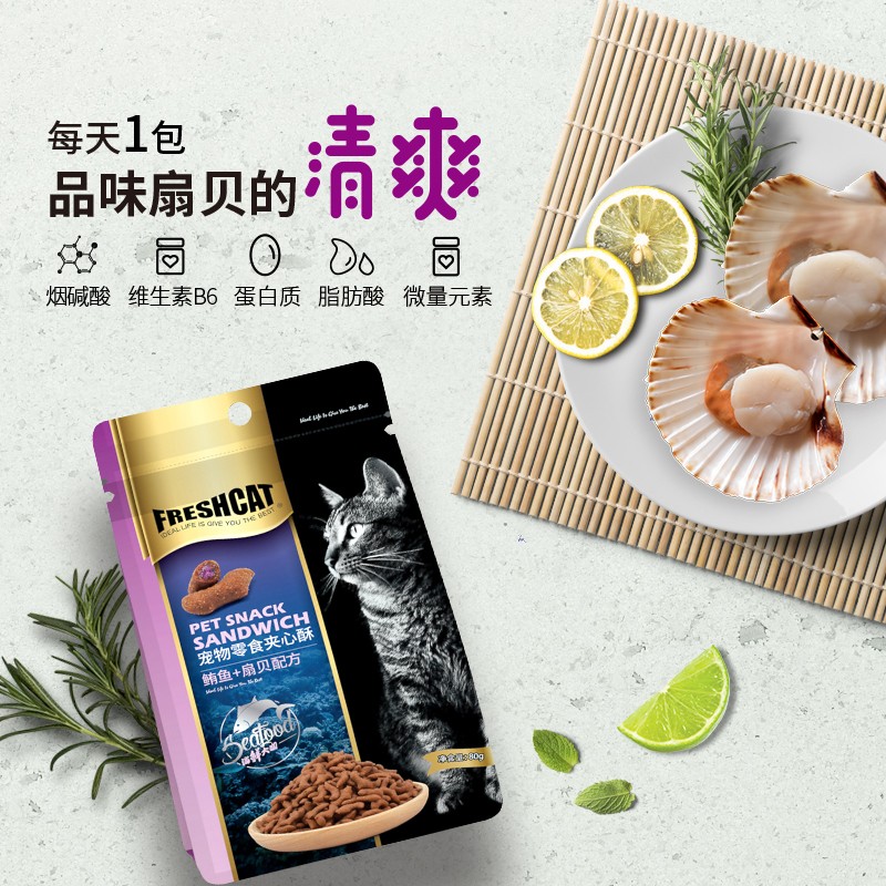 FRESHCAT福瑞诗猫零食猫夹心酥宠物猫咪饼干训练奖励零食磨牙洁齿海鲜 鲔鱼扇贝80g*2袋