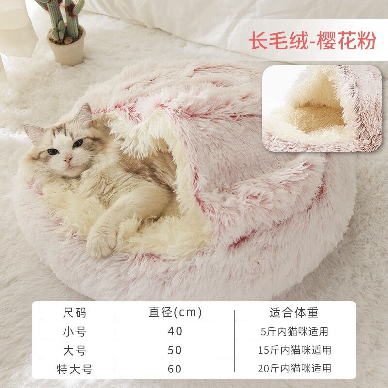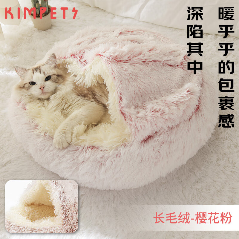 KimPets猫窝四季通用宠物小猫咪屋被子冬季保暖猫狗窝冬天用品封闭式猫床 双面长毛绒(樱花粉) 直径60cm,适合30斤内宠物