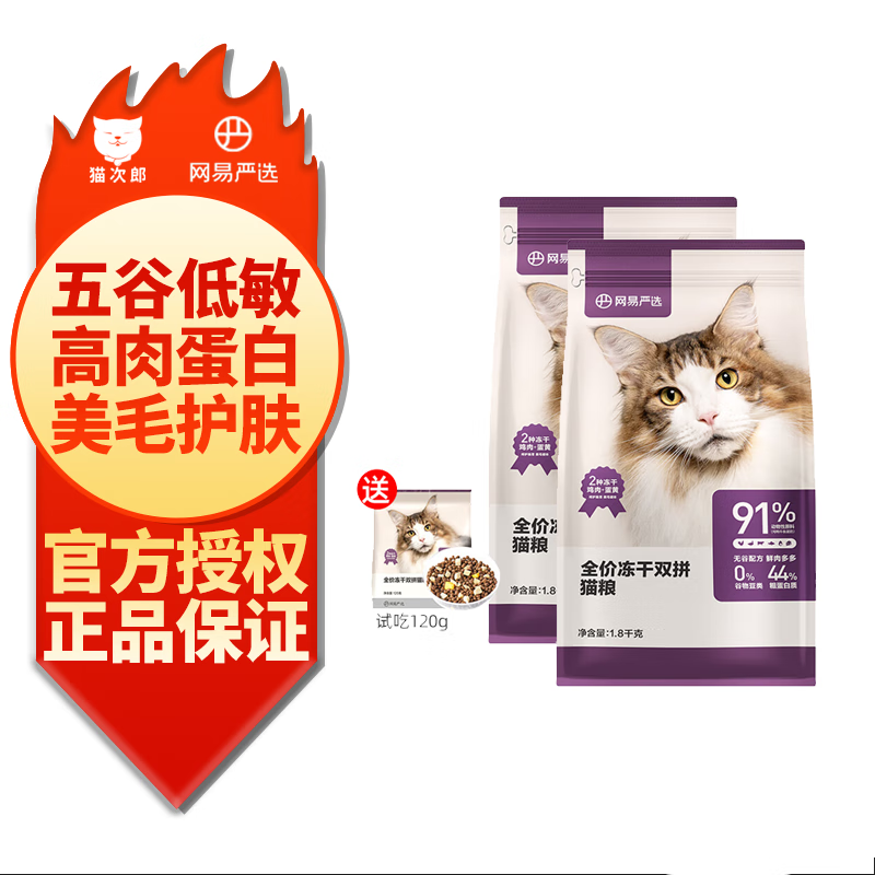 网易严选全价冻干双拼猫粮宠物主粮全价天然无谷粮1.8kg 1.8kg*2包 试吃120g