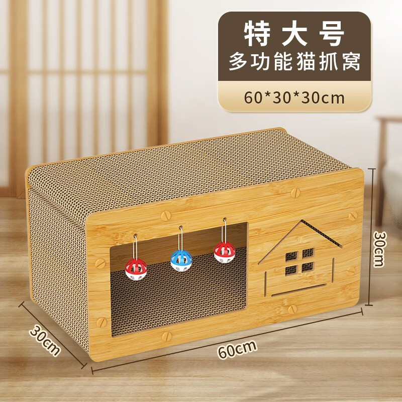 猫后宠物玩具猫抓板窝不掉屑猫抓盆瓦楞纸猫咪玩具防猫抓磨爪板大型猫窝圆形碗形猫抓板椭圆l形猫抓板立式 特大铃铛房子60长30宽30高CM(适用8斤以上)