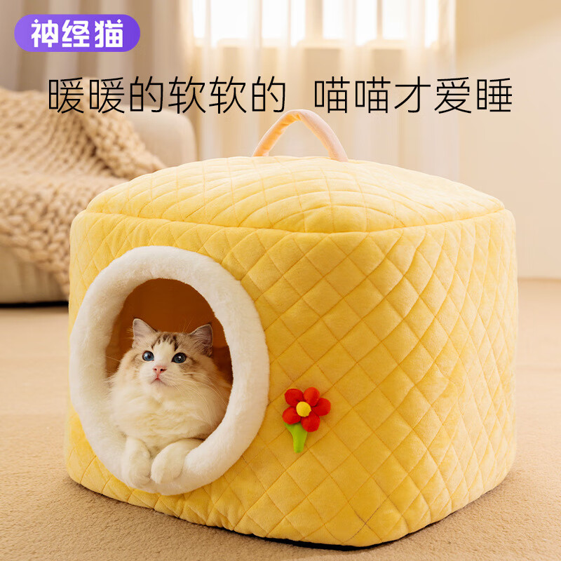 神经猫(shenjingmao)猫窝四季通用狗窝可拆洗全封闭睡觉猫咪床狗床冬天保暖猫屋宠物窝 可手提-温暖小花(两用窝) S-【适合7斤内猫咪】