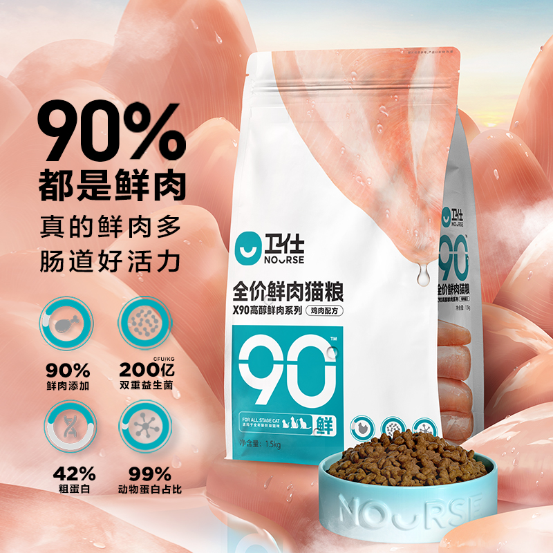 卫仕X90 全价全阶段鲜肉猫粮鸡肉配方1.5kg 高醇鲜肉宠物成猫幼猫全期猫通用粮【胡歌代言】 鲜肉全阶段猫粮1.5kg