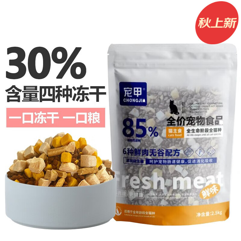 宠甲宠甲无谷猫粮冻干高肉成猫幼猫通用鲜肉营养猫粮英短美短布偶小猫 5拼鲜肉无谷粮10斤(30%冻干)
