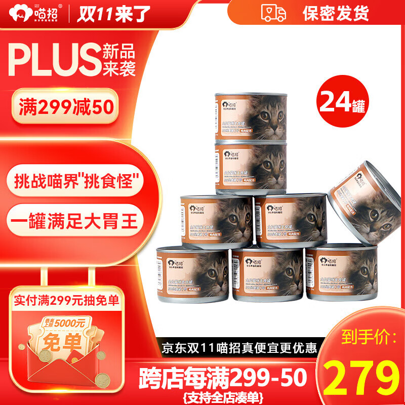 喵招985大容量全价猫咪主食罐头成幼猫补充营养肉补水增肥发腮猫罐头 鸡肉口味170g*24罐
