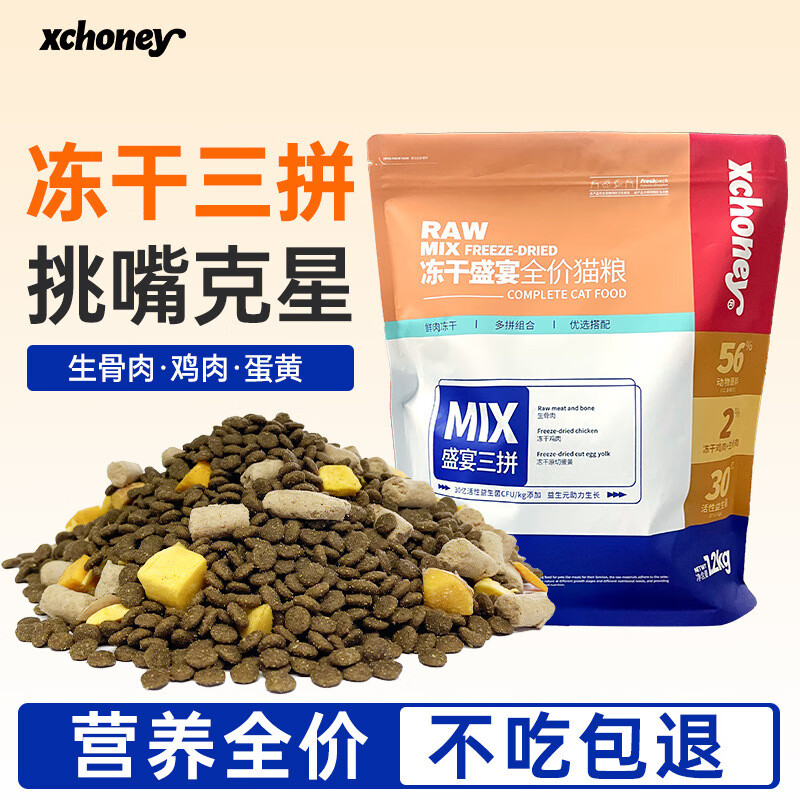 笑宠xchoney猫粮批发成猫幼猫专用粮全价营养冻干猫粮10kg增肥发腮 5kg*2(多猫家庭的选择) 绝味三拼鸡肉粒 生骨肉