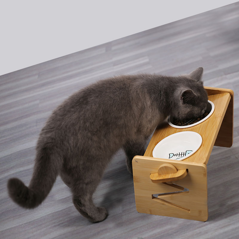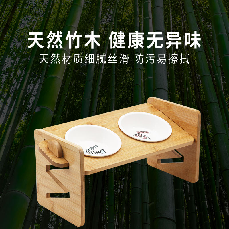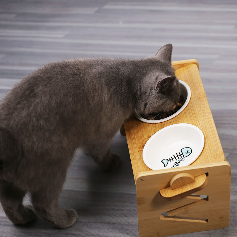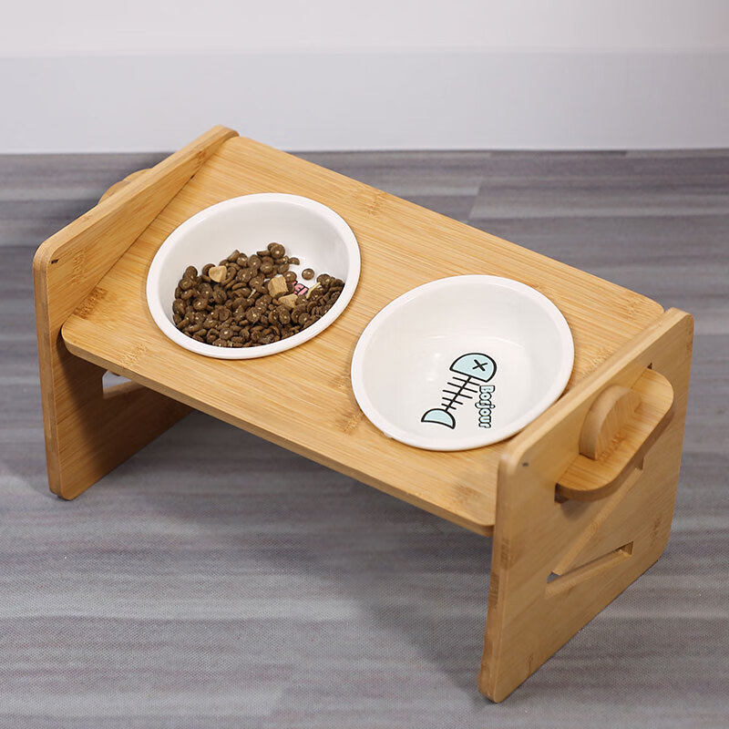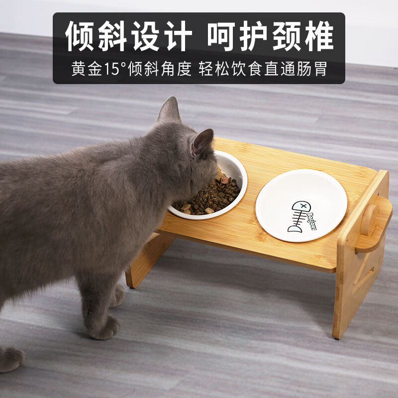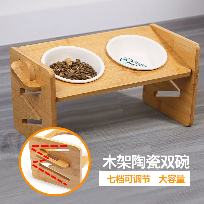 萌嘟星宠 猫狗碗陶瓷双碗木架可调节高度防打翻猫粮饮水碗狗食盆倾斜保护颈椎干湿分离 17cm大号