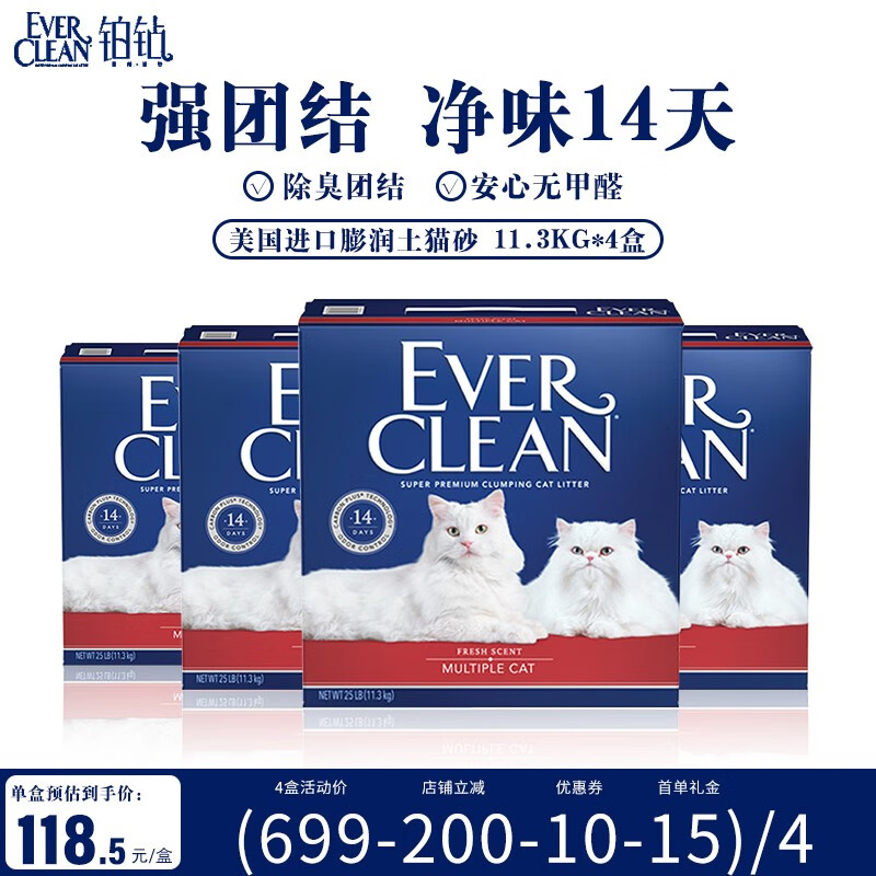 铂钻(EverClean)猫砂EverClean美国进口10Kg低尘活性炭除臭膨润土净味猫沙25磅4盒 红标25磅*4盒