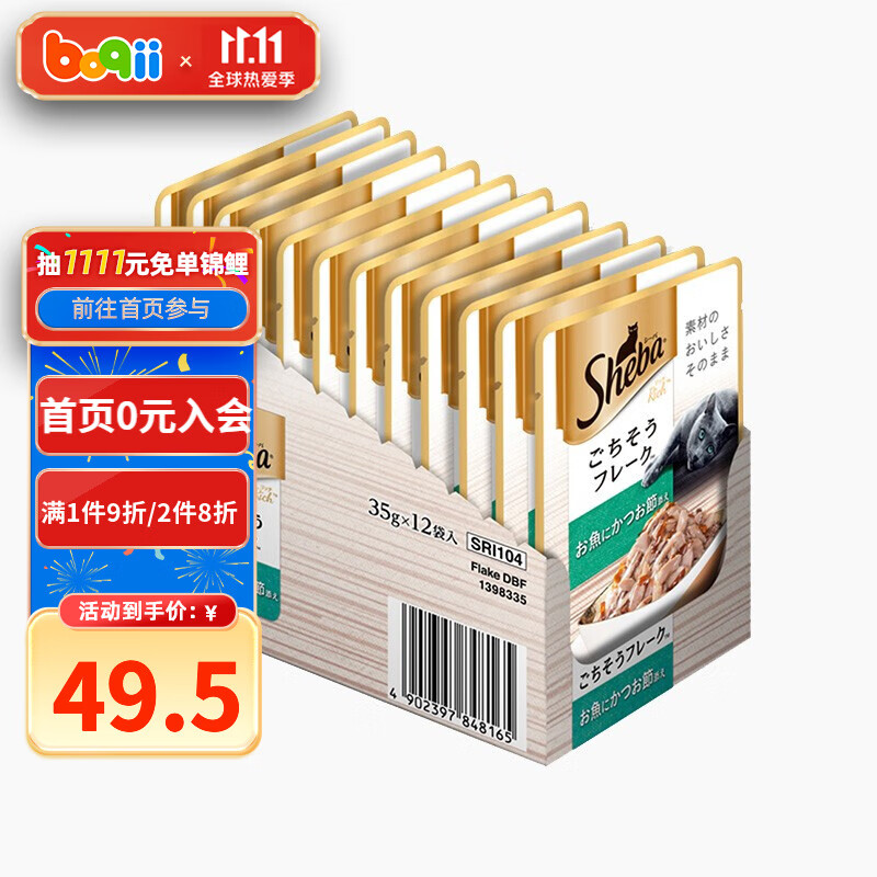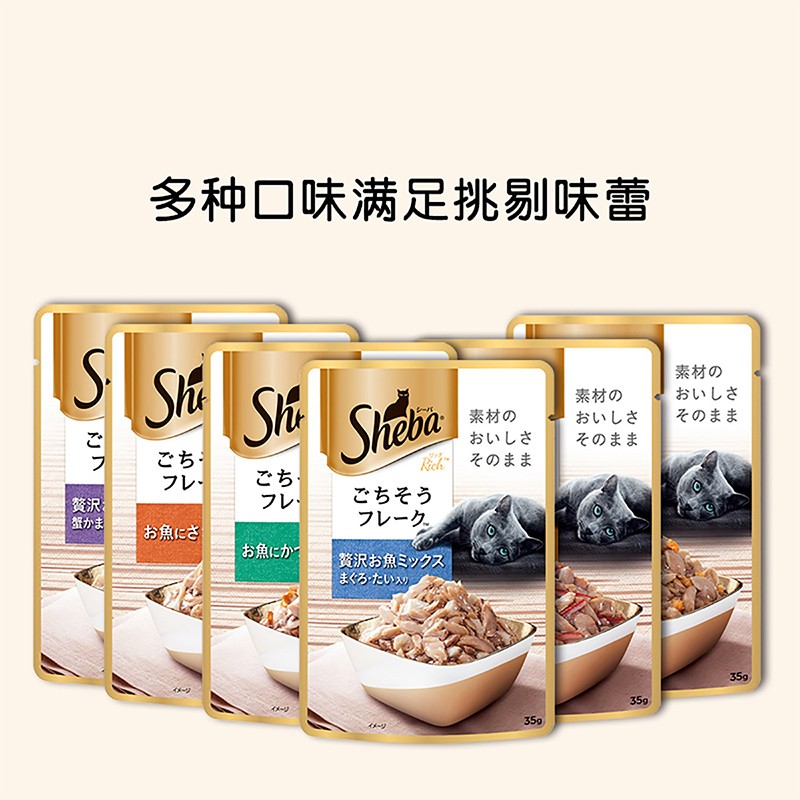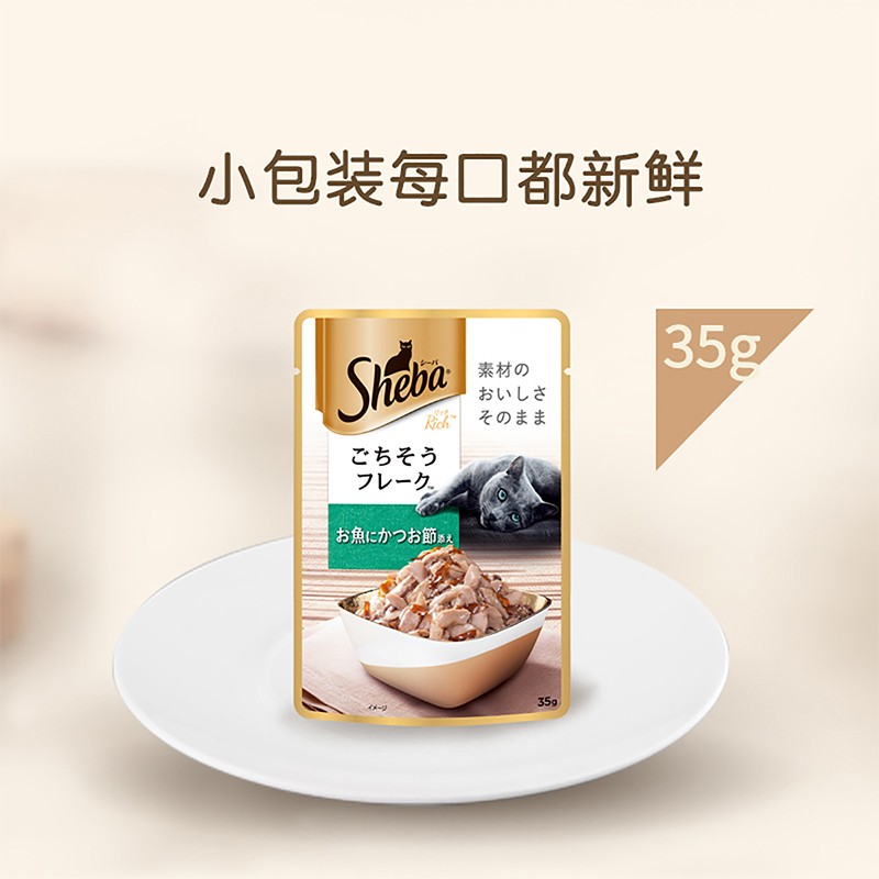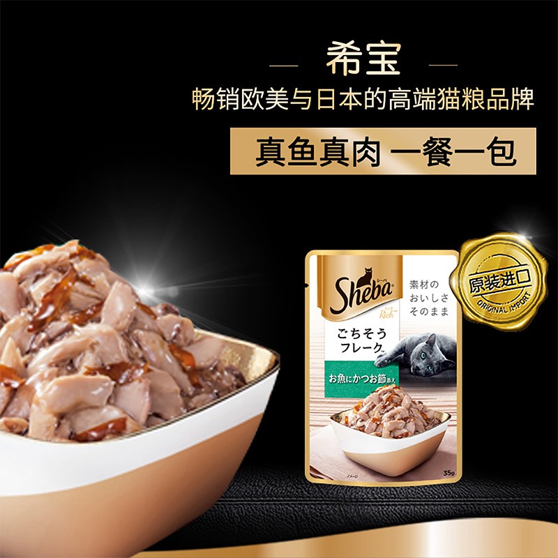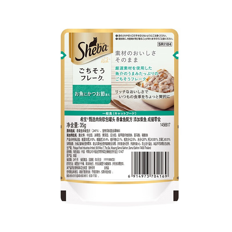 希宝(Sheba)猫湿粮零食 幼猫成猫大龄老年猫妙鲜包零食 宠物猫咪肉块软包 甄选肉块软包吞拿鱼柴鱼成猫 35g*12包