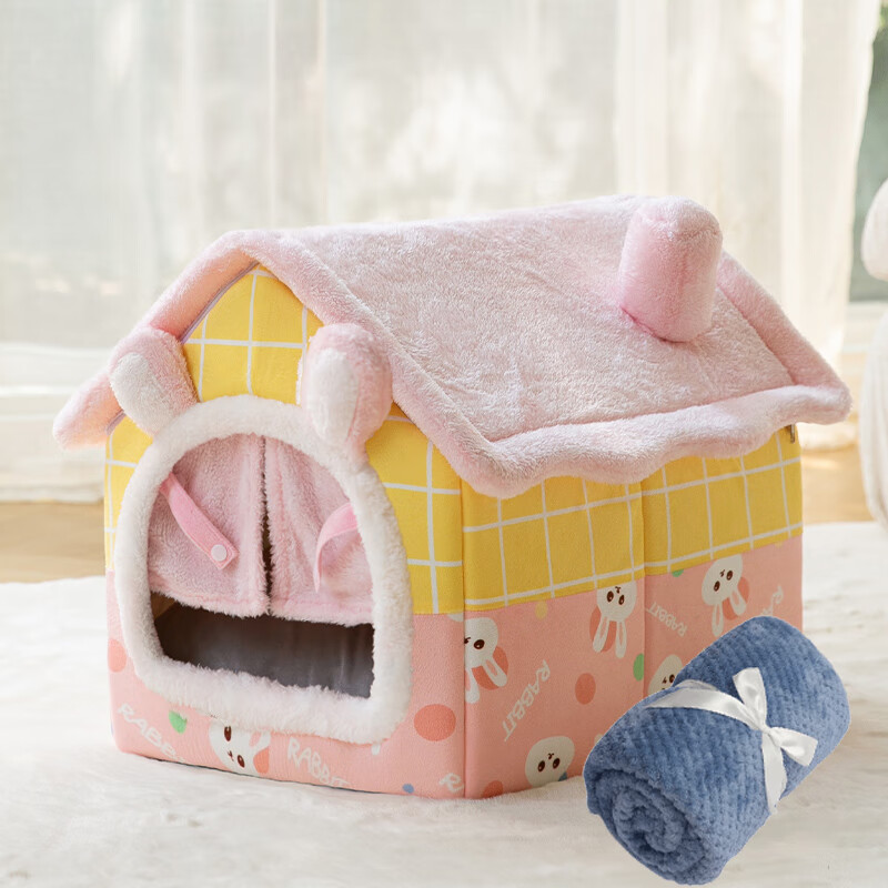 嬉皮狗狗窝房子型冬天保暖小型犬泰迪四季通用可拆洗猫窝狗屋冬季宠物床 兔子门帘窝(搭配毛毯)#门帘可收纳 小型-适合7斤内宠物