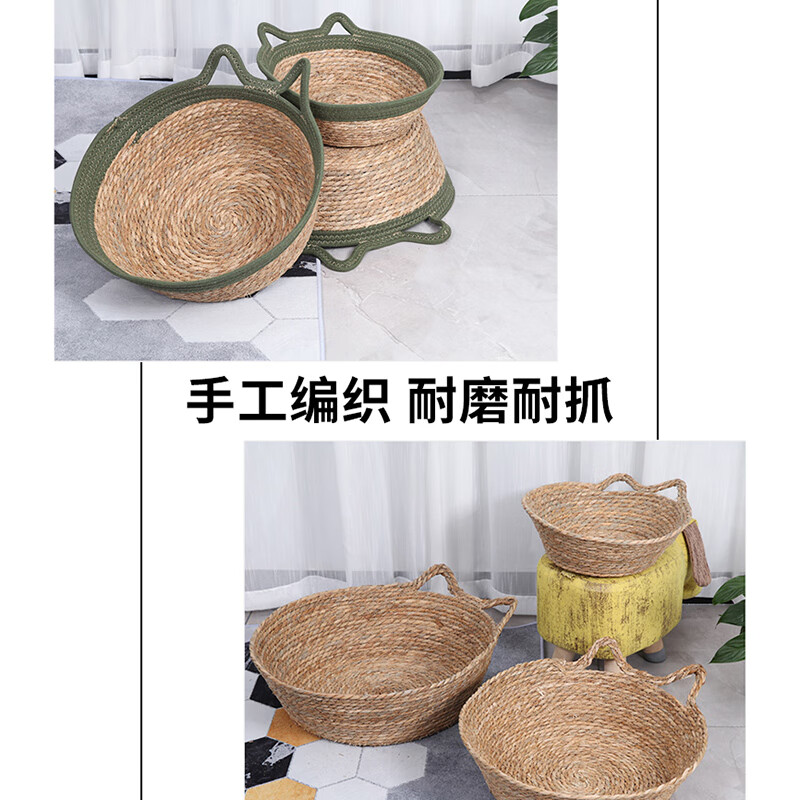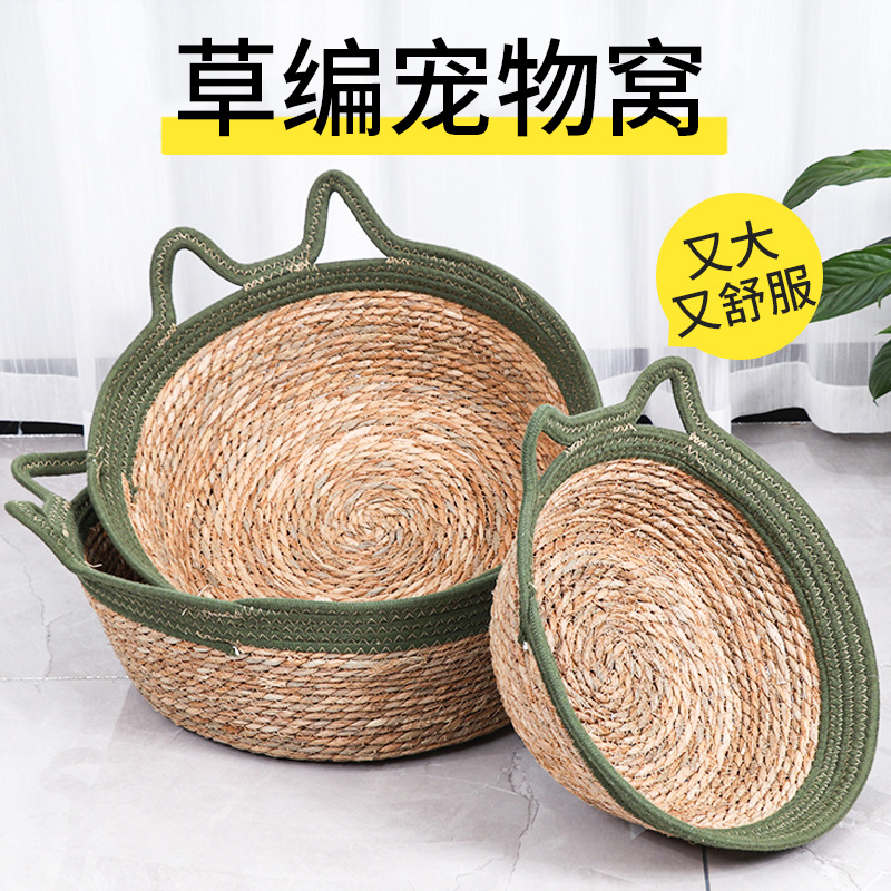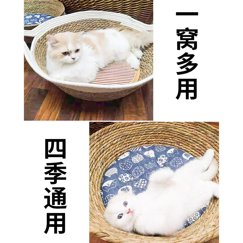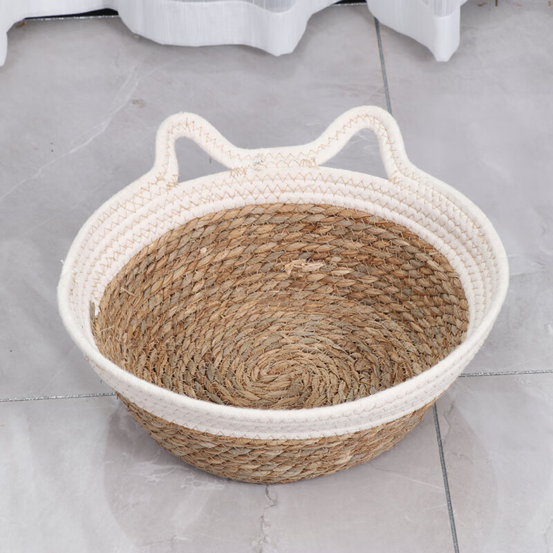 大猫日记 藤编猫窝夏季四季通用编织猫咪窝保暖狗窝垫子草编猫床宠物窝凉席 白色猫耳棉绳款 中号(适用15斤内宠物)
